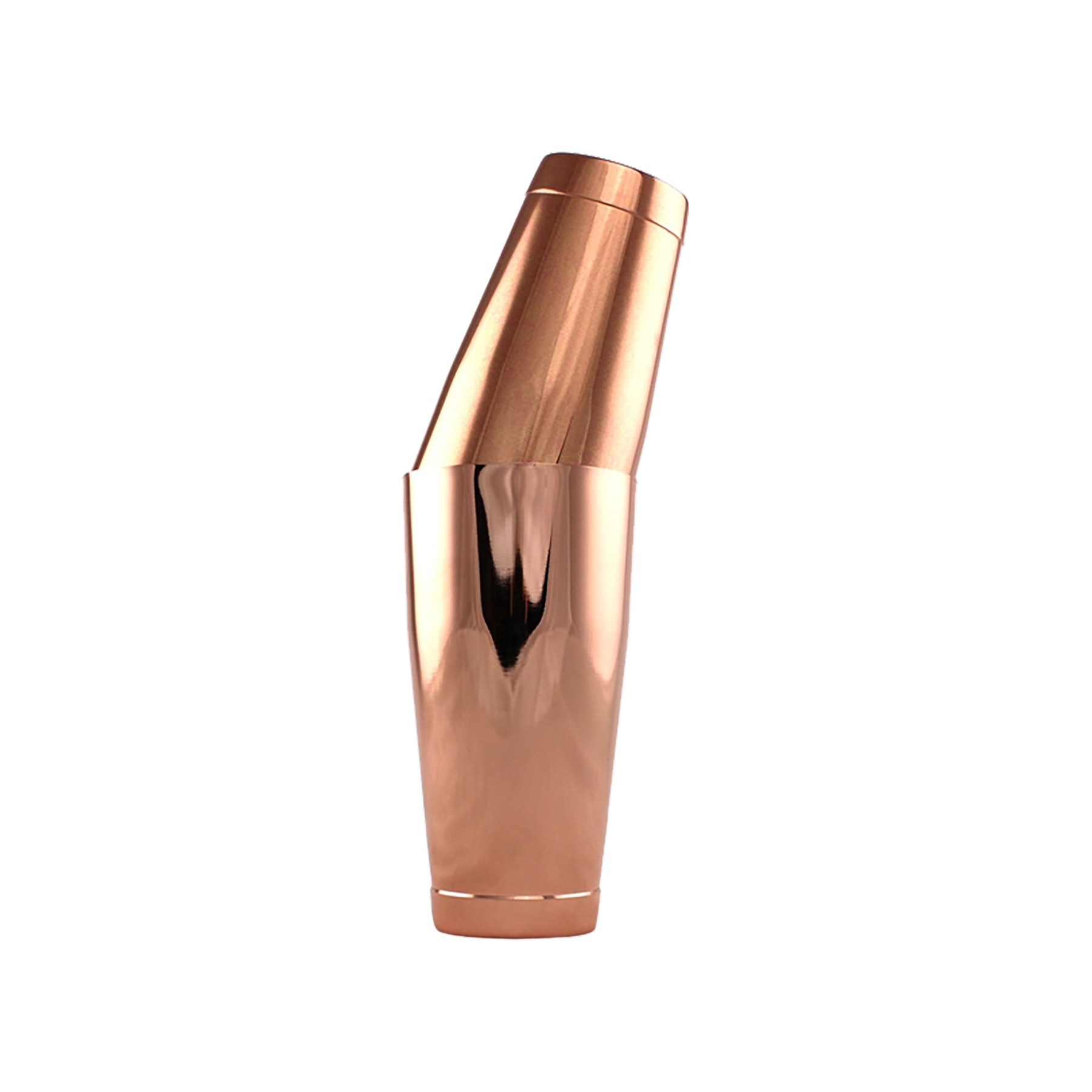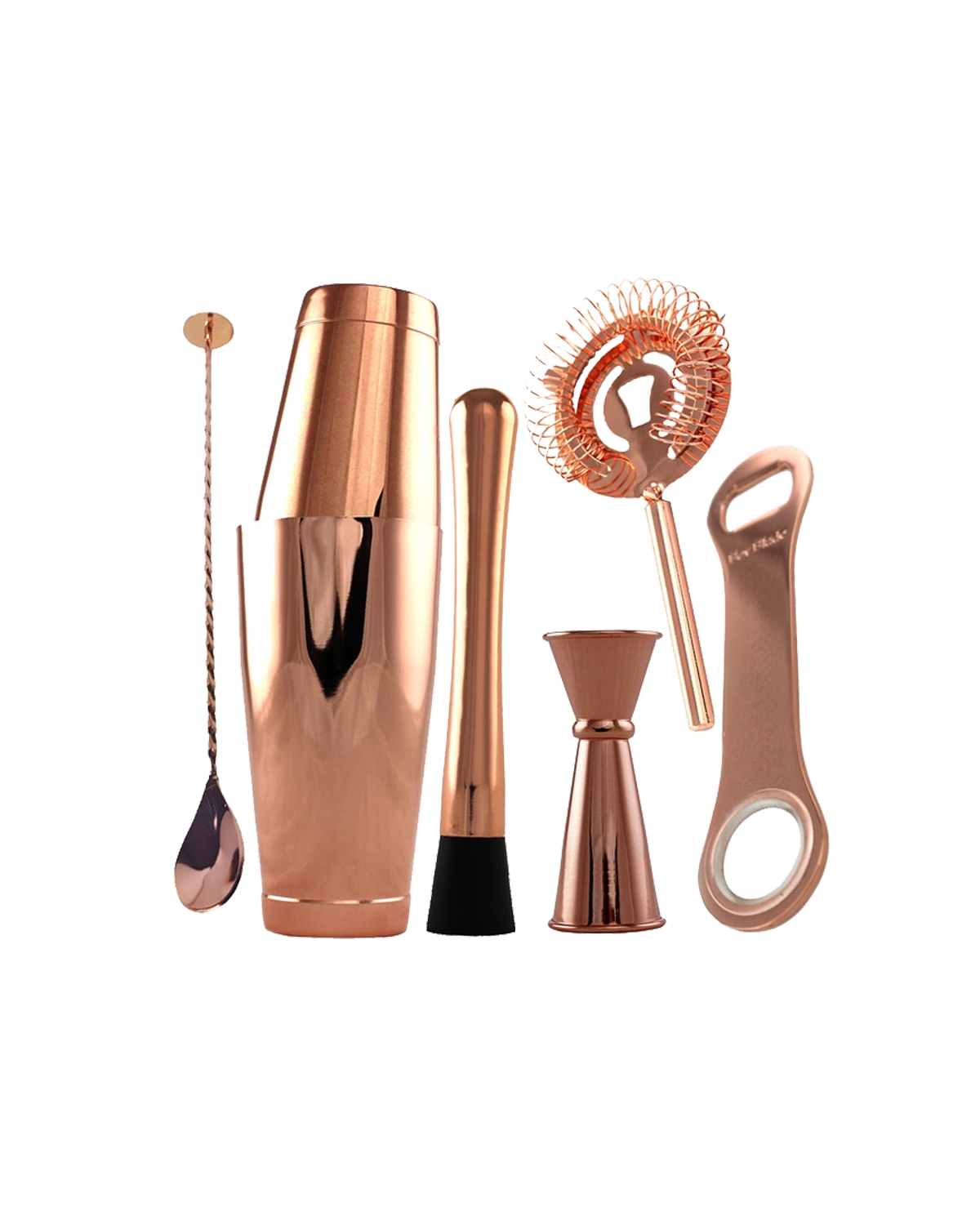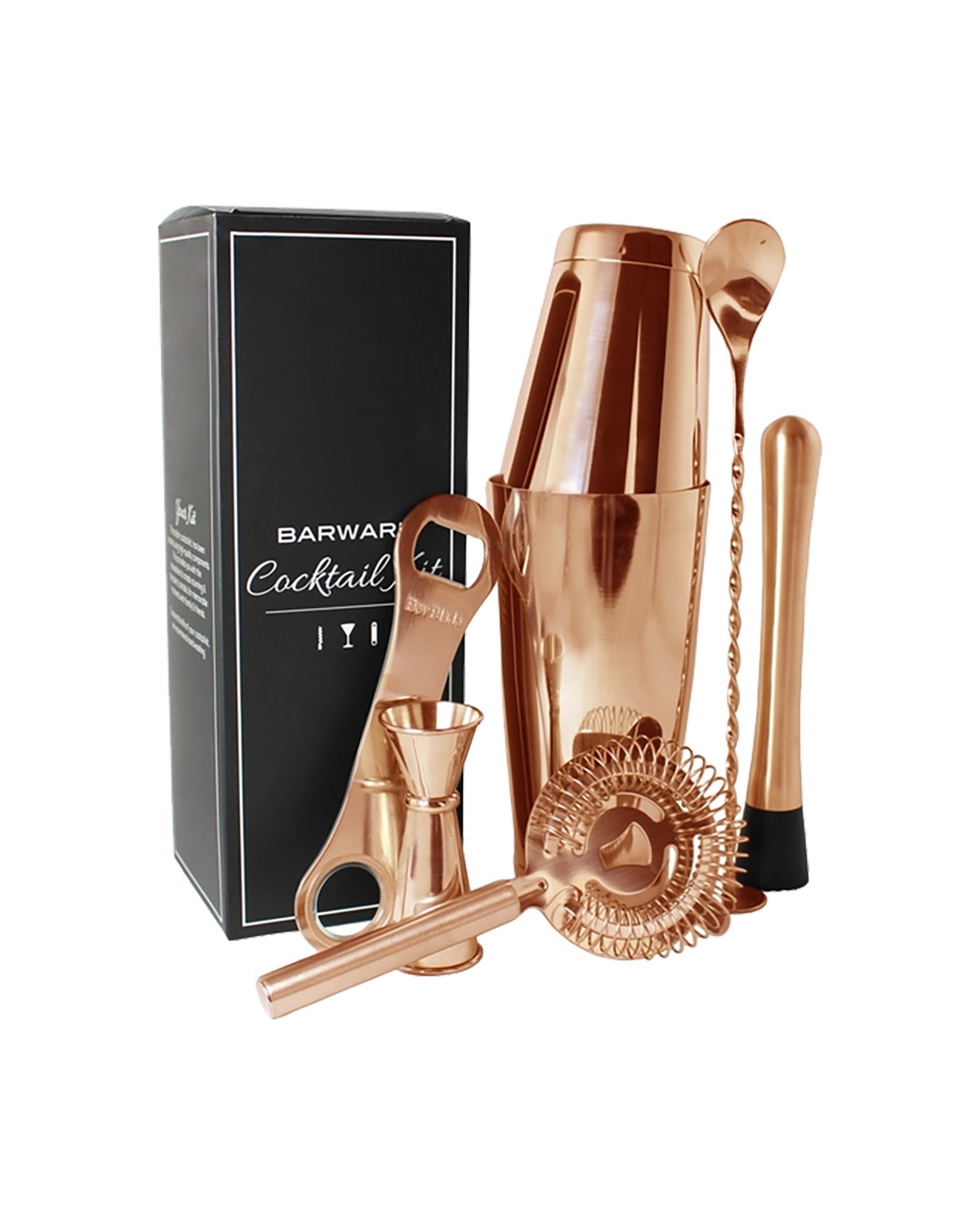The Barware 7 Piece Copper Cocktail Kit includes a standard 828mL Boston Shaker with a weighted base and a 532mL Toby Tin, 15/30mL Japanese Jigger, Premium Hawthorn Strainer, Bar Spoon, Steel Muddler and Bar Blade Speed Opener. These bar tools are made of the highest quality stainless steel with a shiny metallic copper-plated finish. The cocktail kit is designed and tested for use in busy professional bar environments and presented in a black Barware Gift Box 28 x 10 x 10cm